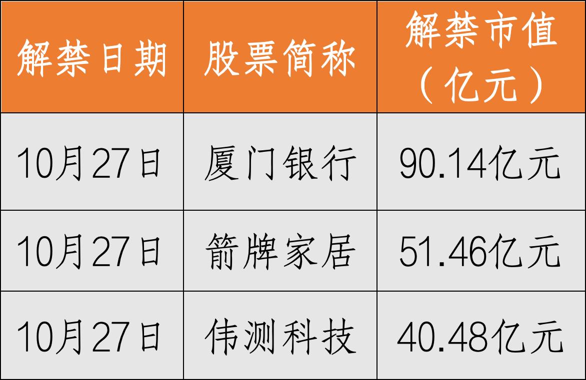 Wind数据显示,本周(10月27日—11月2日)超487亿元市值限售股解禁。从解禁市值排名来看,前三为厦门银行(13.49亿股)、箭牌家居(6.20亿股)、伟测科技(4568万股)。