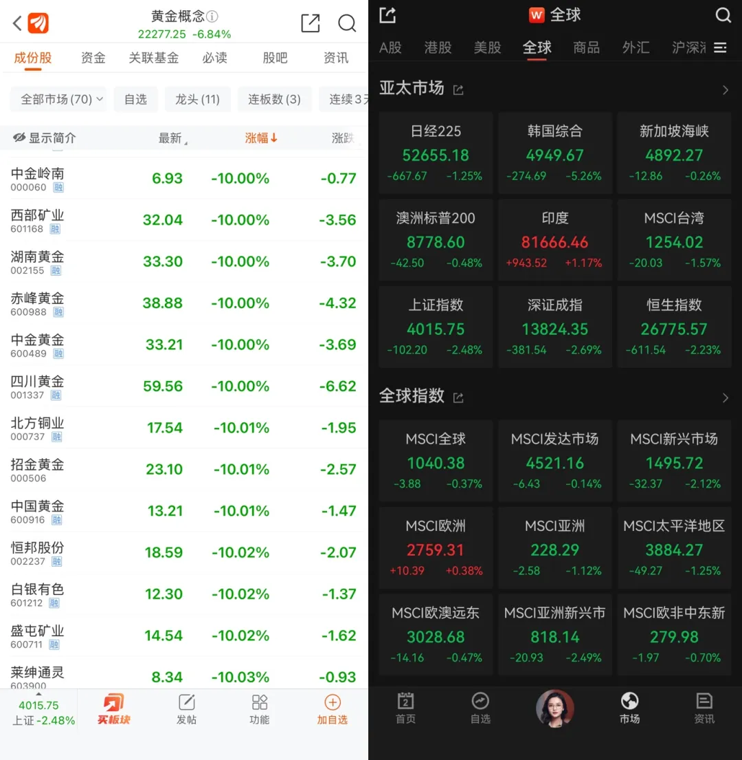 2日,A股市场黄金概念股大面积跌停,黄金白银的持续同样影响到全球股市。相关讨论区甚至有网友调侃:“本月元宝红包收益已经超过投资收益……”