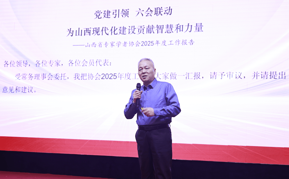 山西省专家学者协会副秘书长、办公室主任石宝新受协会理事会委托作 2025 年度工作报告,全面总结了协会在组织建设、学术交流、智库服务、基层赋能等方面的丰硕成果;随后详细介绍了第二个 “智创山西” 三年行动计划核心内容,明确了未来三年的发展目标与实施路径。