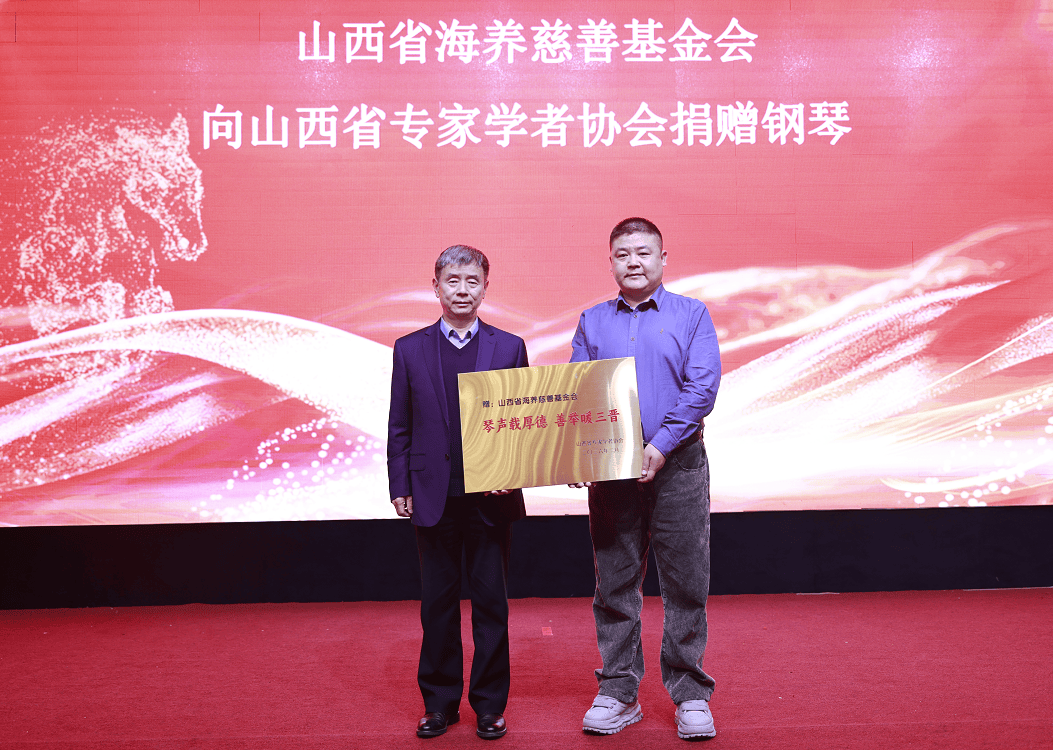 山西省海养慈善基金会执行副会长宋娟和张志军向协会赠送钢琴一台,协会副会长柴志凯上台接受捐赠,并向基金会回赠 “琴声载厚德,善举暖三晋” 牌匾,彰显爱心与责任的双向奔赴。