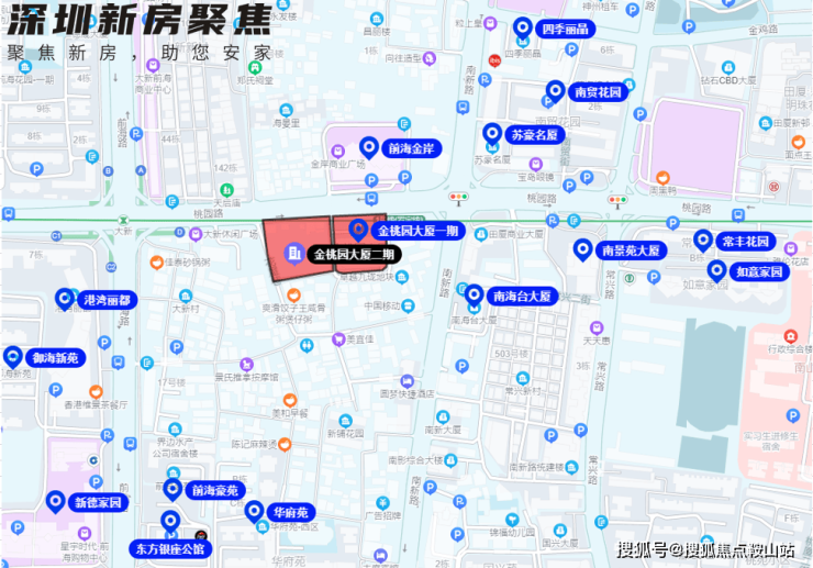 金桃园大厦二期项目位于南山区南头街道大新社区桃园路与大新路交汇处。南头街道位于深圳西部,南山区中西部,地处珠江口东岸、南头半岛西北部,是南山区委、区政府所在地,也是全区政治、经济、商贸中心。