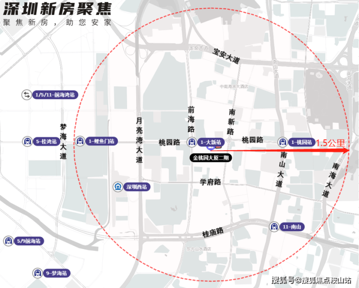 道路交通:南山本就具有近市区的地理位置优势,项目1.5公里范围内又分布有桃园路、月亮湾大道、宝安大道、南山大道、桂庙路(滨海大道)、南海大道等主干道,交通路网较为完善,自驾出行较为便捷。
