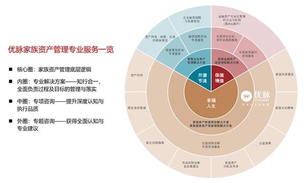 优脉家族办公室成立于2014年,致力于践行“买方定位”,为中国市场的(超)高净值人士提供家族资产管理专业服务,以协助(超)高净值人士及其家庭获得更美好的生活状态为目标,以风险管理为核心,运用金融法律工具,为客户实现家族资产的保全、保值增值、有效使用和如意传承。
