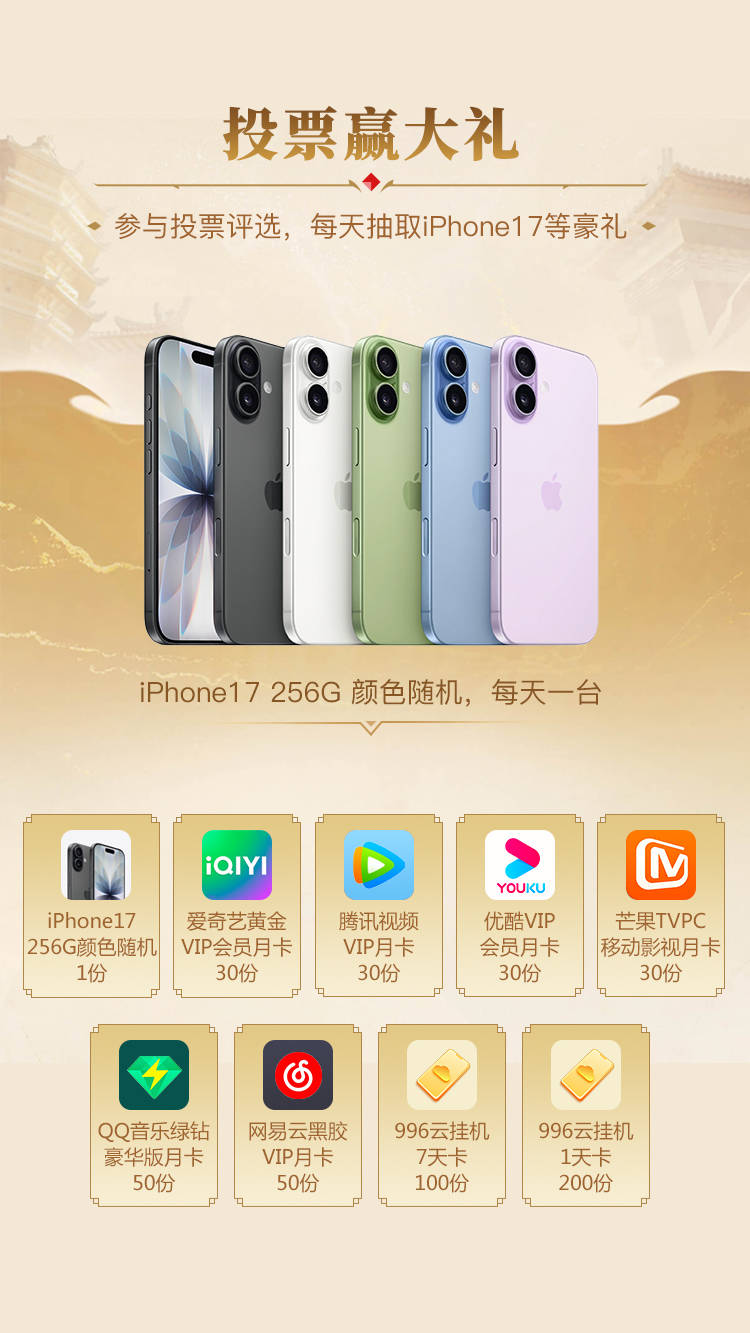 奖池更加丰富!每天都有一台iPhone17等待被抽给天选之子!投完票后将会得到4张抽奖券,投入专属抽奖池就能参与。