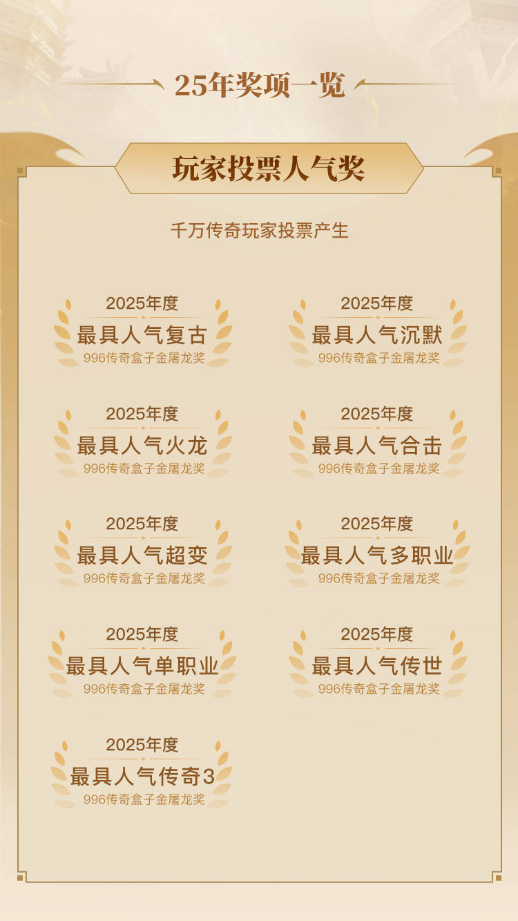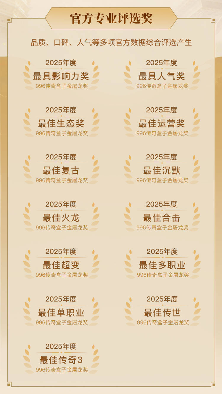 如今,传奇的这把“刀”以全新的形式归来,它就是996传奇盒子为千万玩家铸造的金屠龙奖-2025年度传奇大赏!奖项融合业内甄选和玩家共鸣,旨在全体传奇玩家参与评选最好玩、最具品质、最具人气的年度传奇玩法,为王者加冕!