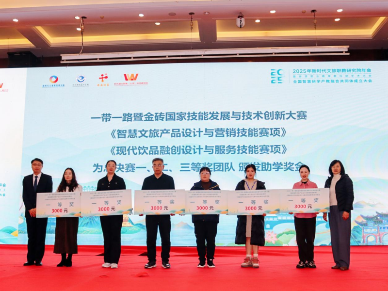 会议期间,还举行了一带一路暨金砖国家技能发展与技术创新大赛《智慧文旅产品设计与营销技能赛项》《现代饮品融创设计与服务技能赛项》两项总决赛获奖团队助学奖金颁发仪式。