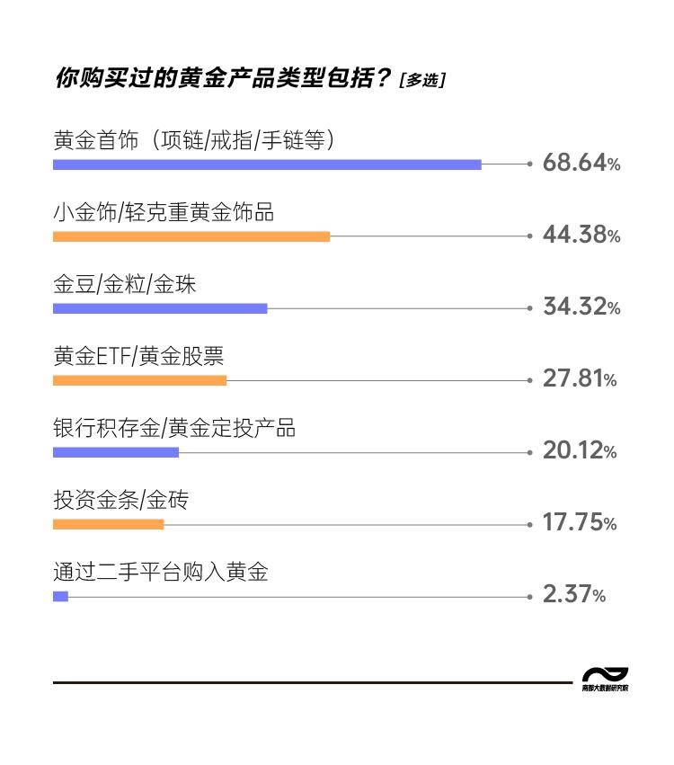 Z世代购买的黄金产品,正在变小、变轻。调查结果显示,项链、戒指、手链等传统黄金首饰依然是主流,占68.64%。紧随其后的是小金饰、轻克重的黄金饰品(44.38%)、金豆、金粒、金珠(34.32%)。