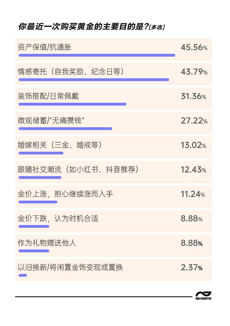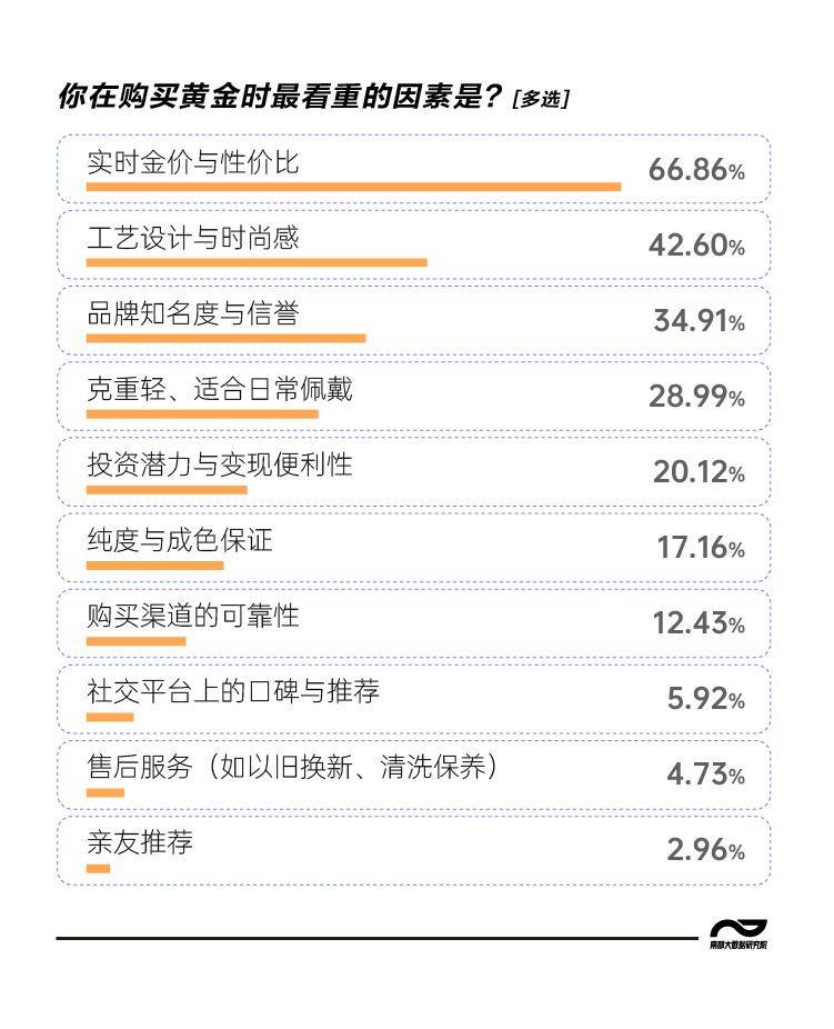 一是消费动机的“自我化”转向。老一辈购金多为“三金”彩礼或家族财富传承,具有强烈的代际义务与炫耀属性。而本次调查中,Z世代则以“自我奖励”和“情感寄托”为核心,黄金成为“悦己消费”,而非“他者凝视”的道具。这反映了原子化社会中个体价值优于家庭面子的心理账户重构,他们更愿为“情绪价值”买单,而非为“社会评价”透支。