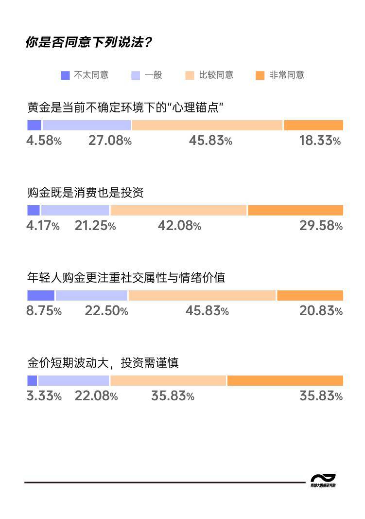 绝大多数受访年轻人认同“购金既是消费也是投资”,同时也清醒地认识到“金价短期波动大,投资需谨慎”,选择“非常同意”和“比较同意”的比例均为71.66%。