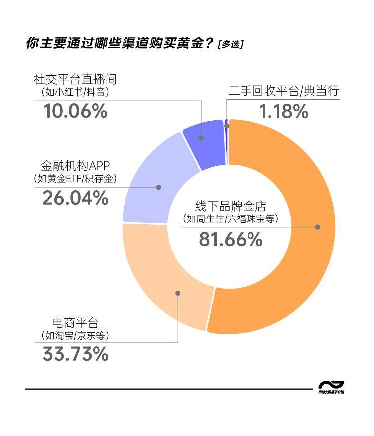 作为互联网原住民,Z世代的购金渠道主打一个“反差”。有81.66%的受访青年首选线下品牌金店,电商平台以33.73%的占比位居第二。