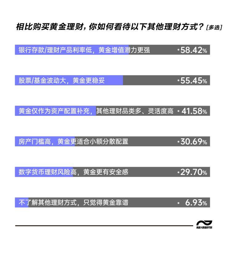 调查中,选择黄金作为理财方式的年轻人,58.42%认为“银行存款、理财产品利率低,黄金增值潜力更强”,55.45%觉得“股票、基金波动大,黄金更稳妥”。可以看出,年轻人将黄金定位为一种更优、更稳健的资产配置补充。