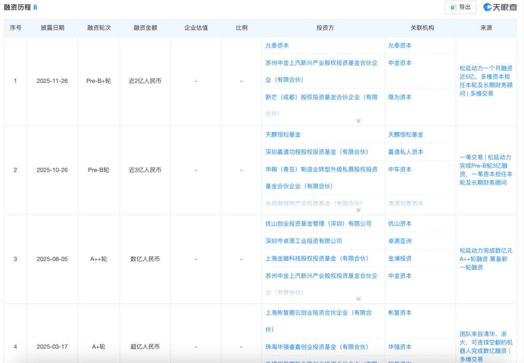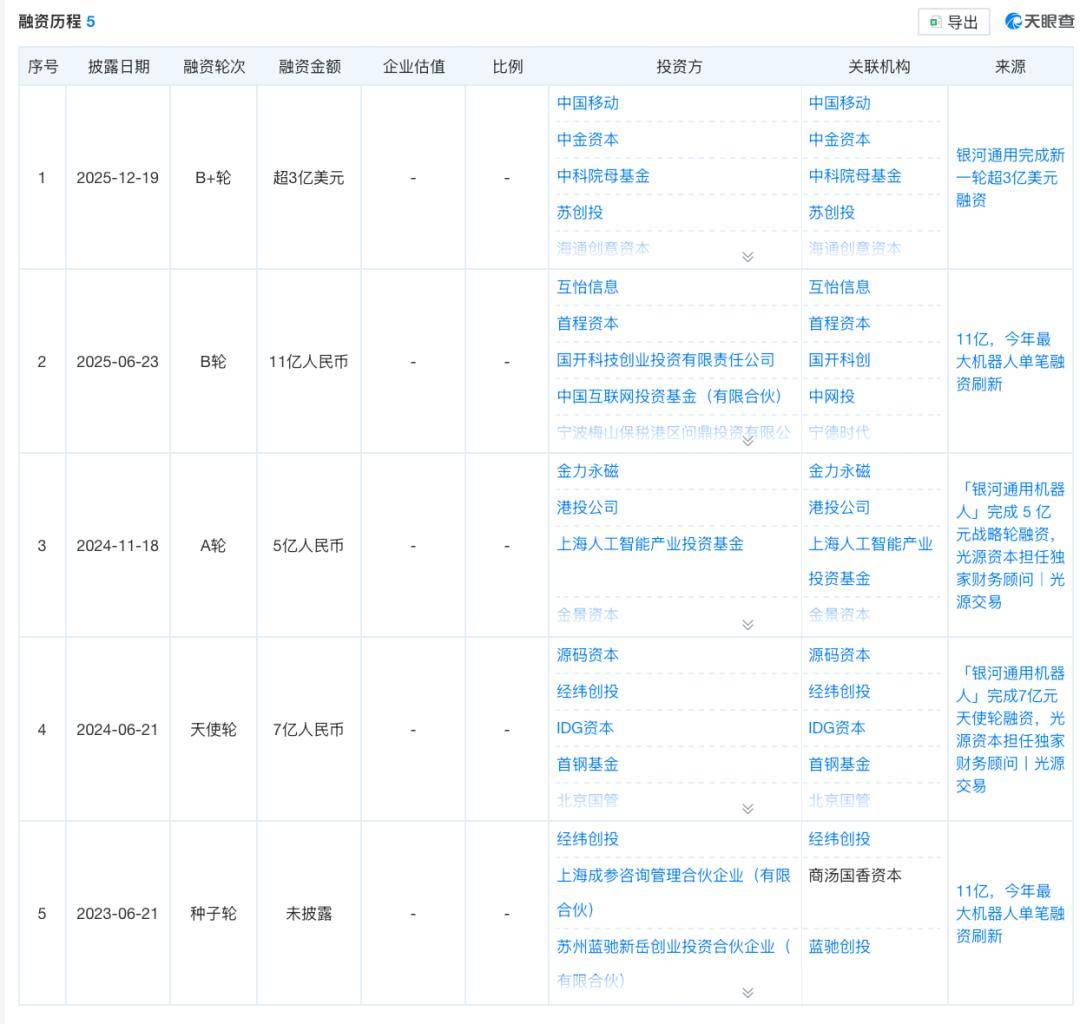 2025年6月,新一轮融资11亿元,宁德时代战投及溥泉资本领投,北京机器人基金、国开科创、纪源资本跟投。12月,超3亿美元融资由中国移动链长基金领投,中金资本、中科院基金、央视融媒体基金等联合注资。